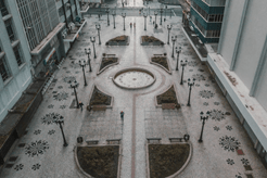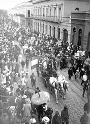 Construída em petit pavé, alterna entre pedras brancas e pretas, desenhos de araucárias surgem e a vegetação escolhida como o símbolo do estado ganha plena forma. Fotografias registraram os desfiles anuais em que carruagens, cobertas por arcos de flores, atravessavam a região central do município, acompanhadas por uma multidão. Das sacadas dos casarões era possível observar o cotidiano urbano em suspensão. A solenidade interrompia o repetir das atividades rotineiras e as duas temporalidades partilhavam o existir, momentos responsáveis pela produção de um material de valor iconográfico inestimável, o coração do comércio vigente conquista o preservar de seu passado.