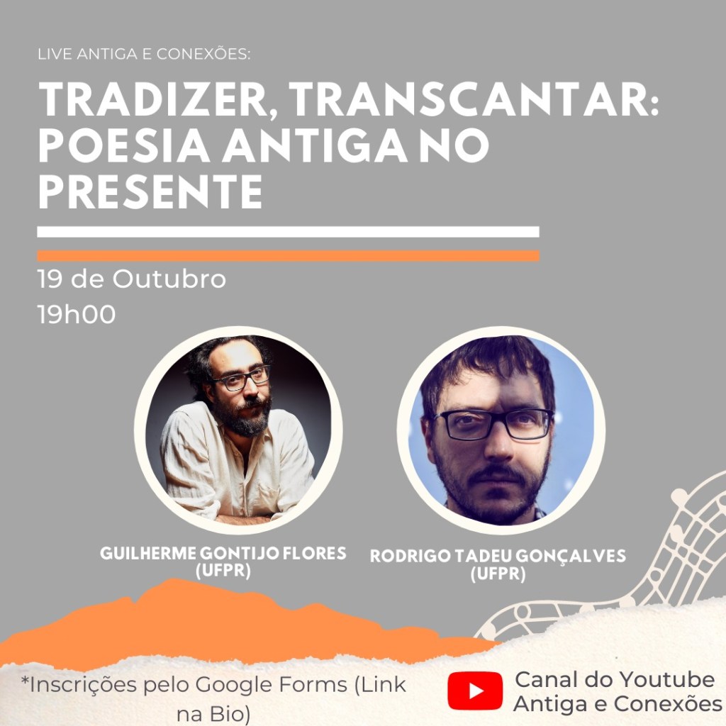 Nós estamos preparando um evento super interessante para a próxima semana! É com muita alegria que recebemos Guilherme Gontijo Flores e Rodrigo Tadeu Gonçalves para a palestra “Tradizer, Transcantar: Poesia Antiga no Presente”, que acontecerá no dia 19/10, às 19h! Estão todas/os convidadas/os!