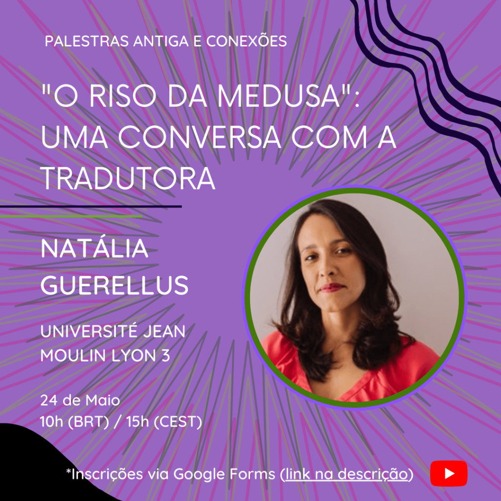 É com grande alegria que anunciamos que no dia 24/05, às 10h (Horário de Brasília), receberemos Natália Guerellus para uma conversa em nosso canal! Como tema da mesa, teremos a tradução feita por ela para o livro “O Riso da Medusa”, de Hélène Cixous.