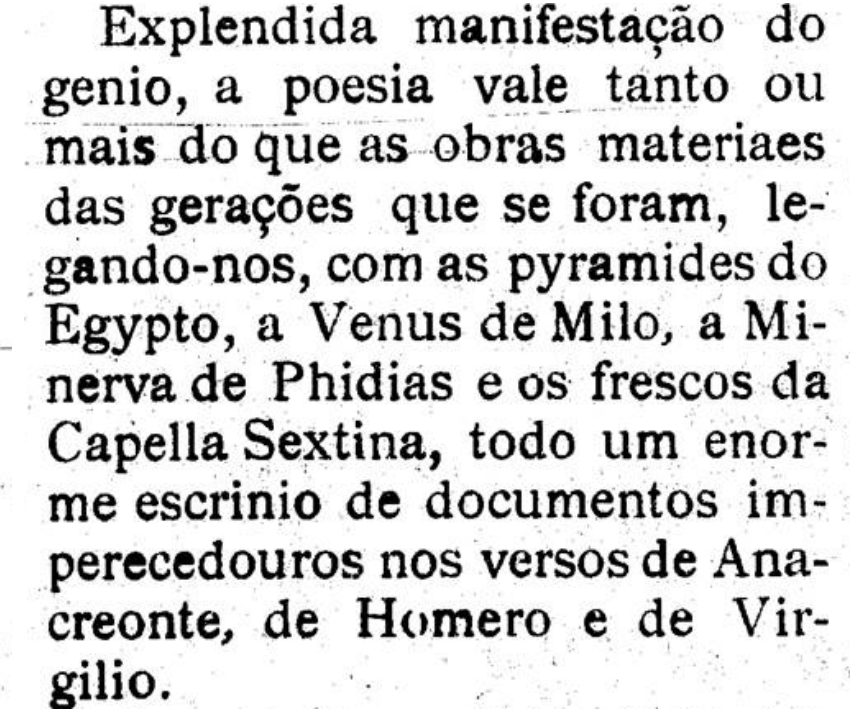 Na revista “A Penna”, em 1897, foi publicado um texto de J. Moraes intencionado a ser uma homenagem ao poeta Dario Veloso. Intitulado “A poesia”, a crônica, mais uma vez, expressa claramente visão saudosista de presente e passado. Pelas ideias de progresso e arte como forma de elevar o espírito humano cada vez mais ao processo civilizatório, J. Moraes, após denotar estar “em desacordo completo com aquelles que dizem que o “piston” de uma machina a vapor vale muito mais do que um soneto”, exprime: