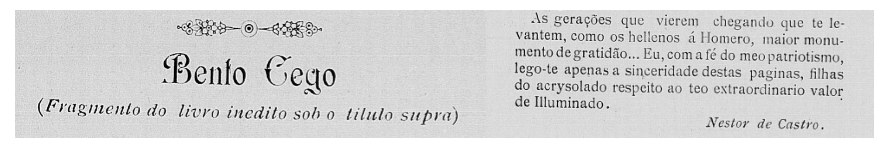 Como indicamos em posts anteriores, em meio à investigação nos periódicos simbolistas paranaenses em busca da recepção greco-romana, nos deparamos com um personagem singular que recebeu especial atenção de Nestor de Castro, e a quem foi dedicado passagens nas revistas simbolistas A Penna e Pallium: revista de arte. É justamente em uma edição de 1897 de A Penna que encontramos a primeira menção a Bento Cego, violeiro errante e vate antoninense nascido em 1821, cuja vida é celebrada no texto “A Musa”, extrato retirado do Diário Paranaense. Neste, o violeiro paranaense, que carregava uma viola ao invés da lira, é comparado a Homero, ambos cantores cegos que viviam de vila em vila, e até mesmo suas feições se equiparavam ao do poeta grego.