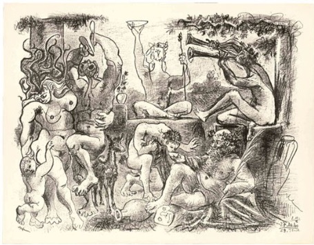 Este seria o caso das mulheres alinhadas aos cultos báquicos, as bacantes, de suas litografias. Observamos como essa criação mantém-se associada com o preceito dionisíaco (descrito primordialmente por Nietzsche em A Origem da Tragédia) das artes de vanguarda. Referenciador de As Bacantes, de Eurípides, esse conceito norteador delimita-se, conforme as definições de Gonzalez (2011) sobre seus impactos ao vanguardismo, em um dionisismo de constante insubordinação e de renovação, ao mesmo tempo refutando e assimilando o antigo neste processo incessante. É, pois, o interesse de Picasso sobre a Antiguidade (ver também BLÁZQUEZ-MARTÍNEZ, 1971, em cujo texto cita uma extensa referência do artista ao mundo antigo) desde a visão revoltosa e renovadora da religião dedicada a Baco.