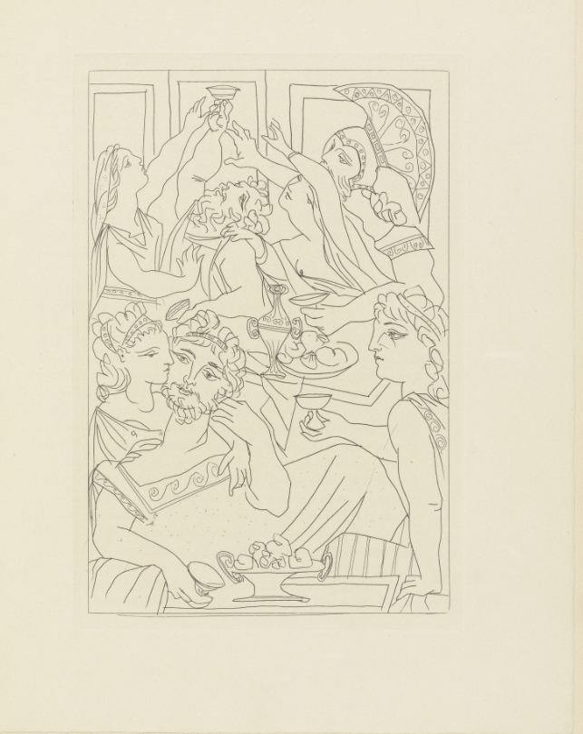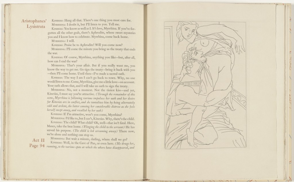 Picasso ilustrou a versão da Lisístrata publicada em 1934, em uma edição especial do The Limited Editions Club, em Nova York. A década de trinta também foi marcada por sua série de ilustrações das Metamorfoses de Ovídio (1931), pela coleção Vollard Suite (1930-1934) e pelo quadro Minotauromaquia (1935). Assim, muitas das referências ao mundo antigo na obra do cubista se concentram nesse período. Em textos anteriores, destacamos a influência surrealista e psicanalítica dessa fase do pintor; portanto, essas relações não serão aprofundadas aqui, apenas tangenciadas. Silva (2017), ao tratar da ideia freudiana de pulsão de vida nas obras de Picasso, demonstra que, nesse período, o artista vivenciou um caso com a modelo adolescente de dezessete anos, Marie-Thérèse Walter, com quem teve uma filha. Citando Silva (2017):