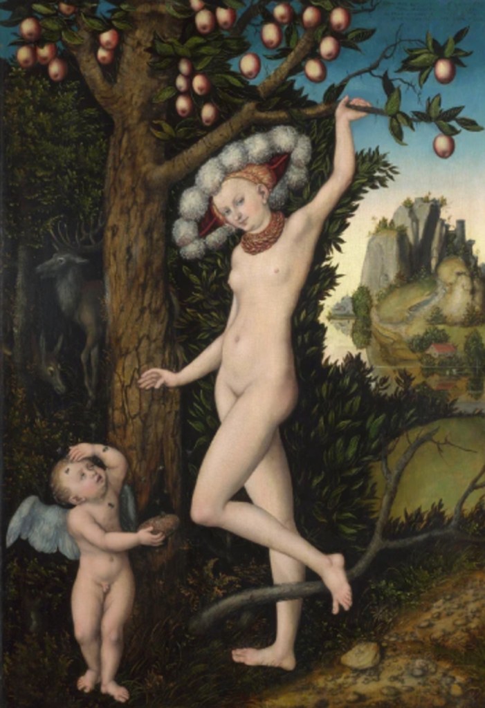 No período do Renascimento, com o fim da moral religiosa da Idade Média, o erotismo, a sensualidade e a beleza passam a ser mais retratados por artistas, que resgatam os princípios da Antiguidade Clássica, como, por exemplo, a completa nudez das figuras femininas, sem ter necessariamente um caráter sexual. Nesse momento, Vênus é representada anatomicamente mais avançada e idealizada que as figuras anteriores. A partir daí, tem-se um retorno a Vênus Celestialis, transformando-a em um modelo de excelência espiritual, não apenas um objeto de desejo físico (JULIÁN, 1992). A consolidação desses traços de Vênus acontecerá na famosa obra de Sandro Botticelli, O Nascimento de Vênus. No entanto, as pinturas referentes à deusa do amor não se limitam ao Renascimento italiano. Muitas obras foram feitas utilizando os mesmos conceitos: uma beleza sofisticada, com um erotismo sutil, representado pela exposição de sua nudez. Uma dessas obras é a de Lucas Cranach, figura importante do renascimento alemão, que retrata Cupido reclamando com Vênus por abelhas o terem picado na tentativa de roubar-lhes o mel (fig. 01).
