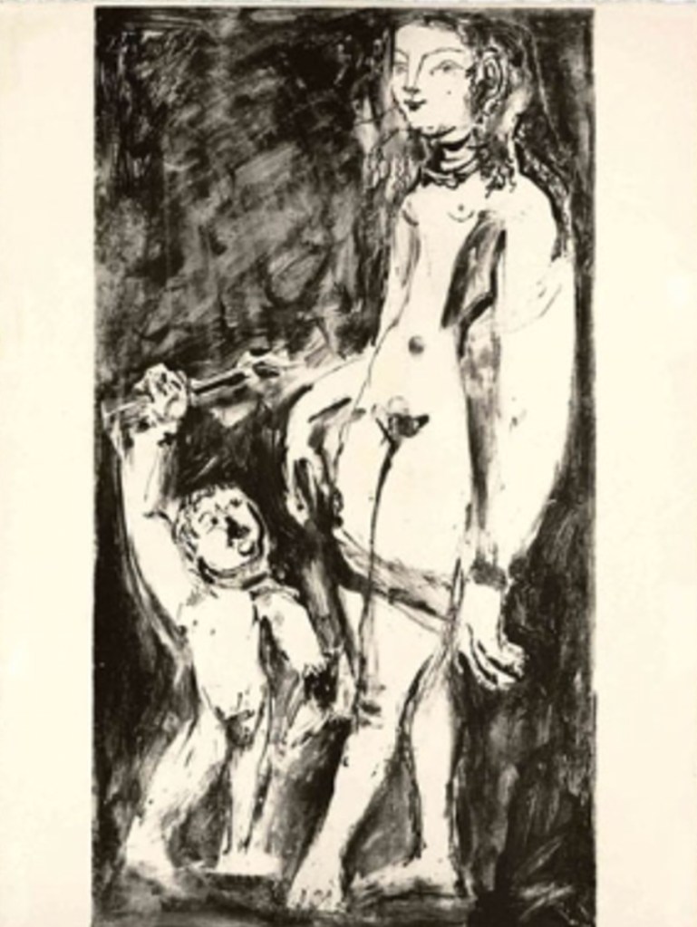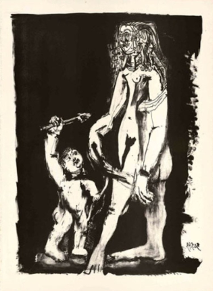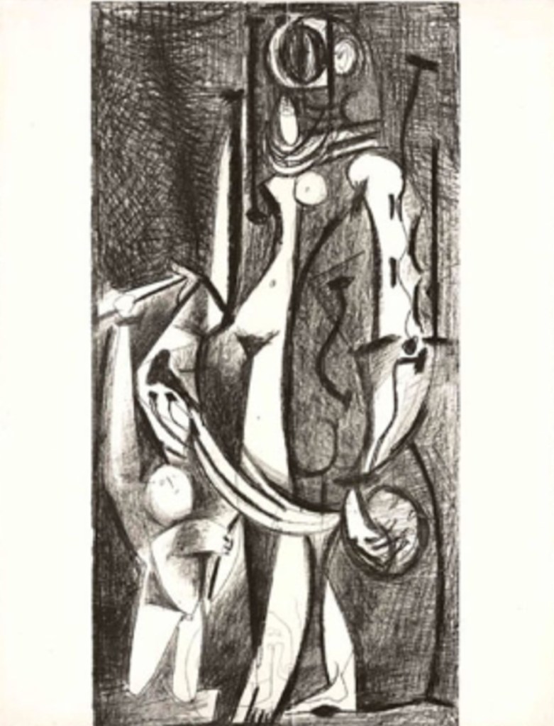 Posteriormente, a divindade continuou sendo representada na arte, adaptando-se com os protótipos de beleza de cada época e localidade, mas ainda, geralmente, associada a essa sensualidade. Na arte contemporânea de Picasso, o corpo de Vênus aparece fora do lugar do clássico. O artista malaguenho, na década de 1940, recriou a obra Vênus e Cupido, de Cranach, não só uma, mas quatro vezes. Nessas litografias, ele segue o modelo com certa fidelidade, porém destacou o sexo da deusa e a flecha que Cupido aponta para ela, inexistente na primeira versão (fig. 02, 03 e 04). Além disso, o corpo da divindade aparece fora do padrão clássico, desproporcional e deformado. Ou seja, Picasso não faz uma cópia fiel da obra original, mas a utiliza como material para uma nova invenção. Inclusive, no período, Picasso declarou:
