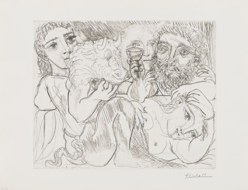 Olá pessoal, esperamos que estejam todos bem! Chegando ao fim de nossa trajetória no qual nos debruçamos na recepção dos Clássicos nas obras de Picasso, no texto de hoje iremos explorar a interpretação paranaense sobre Suite Vollard do artista malaguenho. Como apontamos no texto anterior, quando o Museu de Arte Contemporânea do Paraná trouxe em 1994 para o estado a exposição Suite Vollard – Série de 100 gravuras originais de Picasso, o Museu de Arte do Paraná propôs um projeto paralelo, produções artísticas da interpretação da obra Minotaure, Buveur et Femmes, este reunidos no catálogo Suite Vollard, Picasso – Uma Interpretação Paranaense, organizado pelo MAP no mesmo ano.