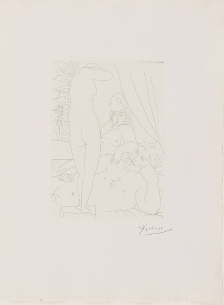 Reclining Sculptor and Model with Mask (Le Repos du sculpteur et le modèle au masque). Coleção Vollard Suite. 1933. Fonte: Colby Museum of Art.