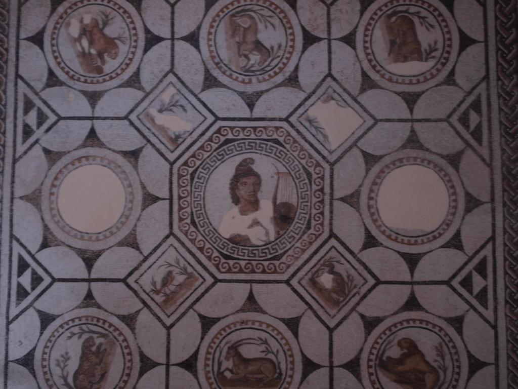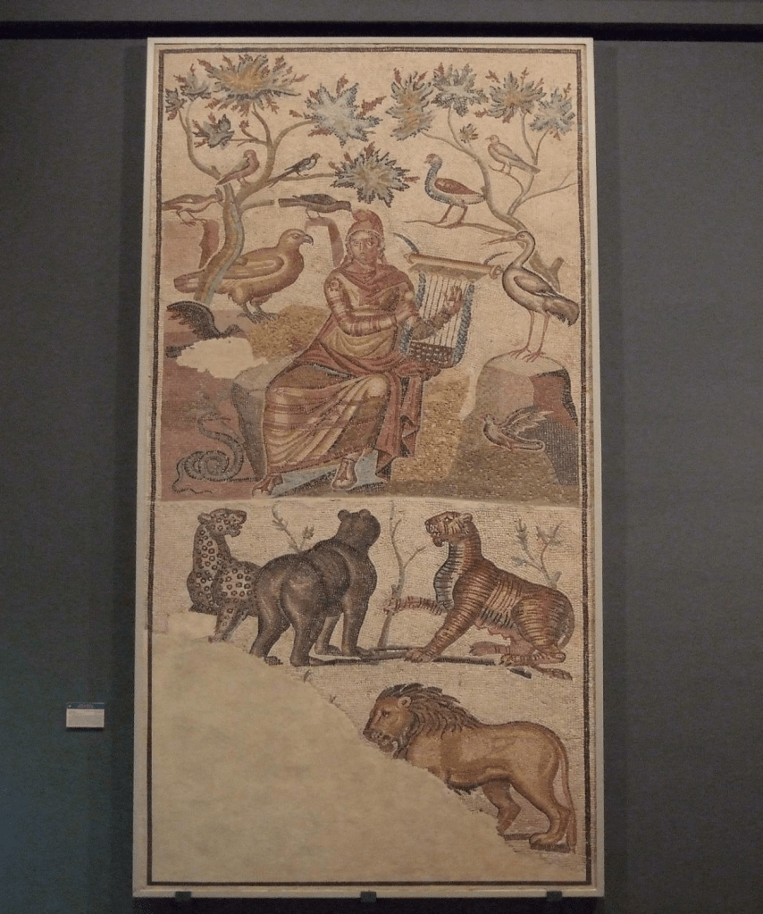 Mosaico do museu arqueológico de El Djem (Tunísia), descoberto no bairro de Bir Zid e datado do século II. Disponível em: < https://commons.wikimedia.org/wiki/File:Mosaique_Orph%C3%A9e_El_Jem.jpg >. Acesso em: 15/09/2025