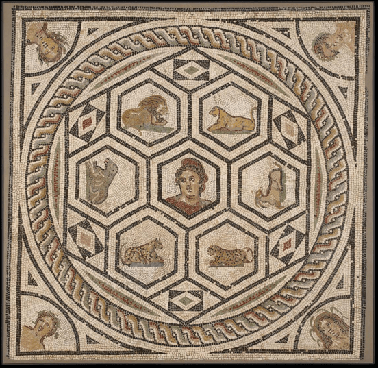 Orfeu rodeado de animais com as quatro estações nos cantos. Saint-Romain-em-Gal, França. Descoberto em 1899. Atualmente no J. Paul Getty Museum, Los Angeles. Disponível em: < https://mythotopia.eu/?p=artvis&id=46&lang=en >. Acesso em: 15/09/2025.